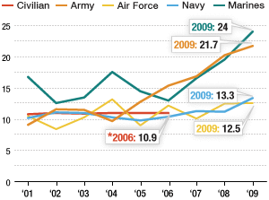 It's not just returning veterans that are attempting suicide, it's also current service personnel. The study goes on to point out that between 2005 to 2010, approximately one service member would attempt suicide every 36 hours. Nearly as many American troops both at home and abroad have committed suicide in 2010 as were killed in combat while fighting in Afghanistan. Many are citing a lack of mental health programs in the U.S. military system, both for current members of the military and as citizens when they come back home.