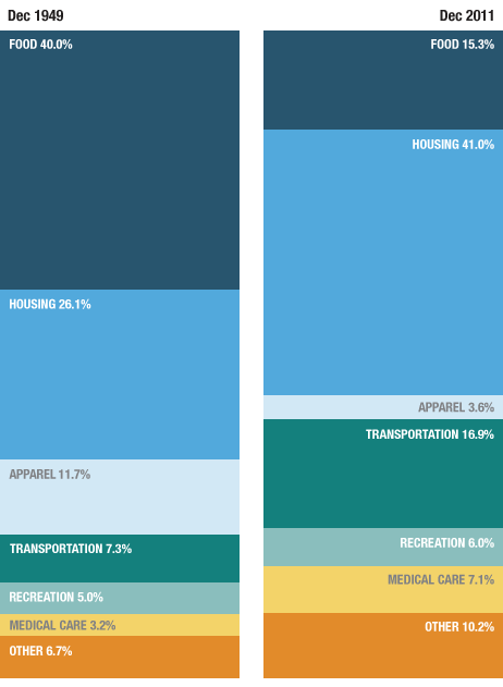 American's spend far less on food today as they did 62 years ago, almost 25% less in fact. There has almost been a complete switch in expenditure in housing expenses and food during this period as well. Transportation has risen, along with health care, but notably, apparel has decreased significantly ( maybe higher quantities of low cost clothes [Old Navy]?).